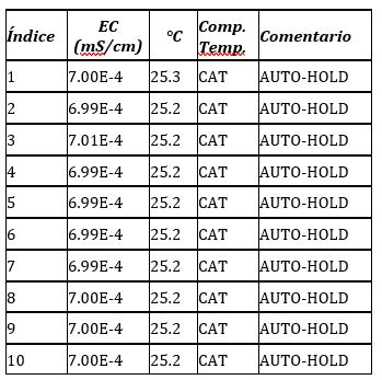 enjuague debe poseer una conductividad menor o igual a 2,1 μS/cm promedio.