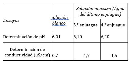 cuarto enjuague 1,7 y 1,5 μS/cm, respectivamente; obteniéndose resultados